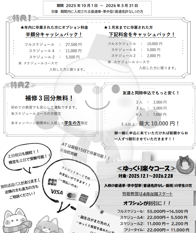 ・友達と一緒に申込に来ていただくと総額からお一人ずつ割引